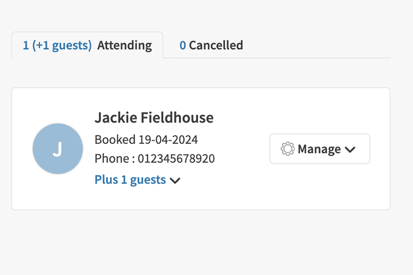 - Your attendees are listed in rows below. The member who booked them will display as the contact, with the date that they booked, their phone number and information about how many guests they have booked to bring with them.